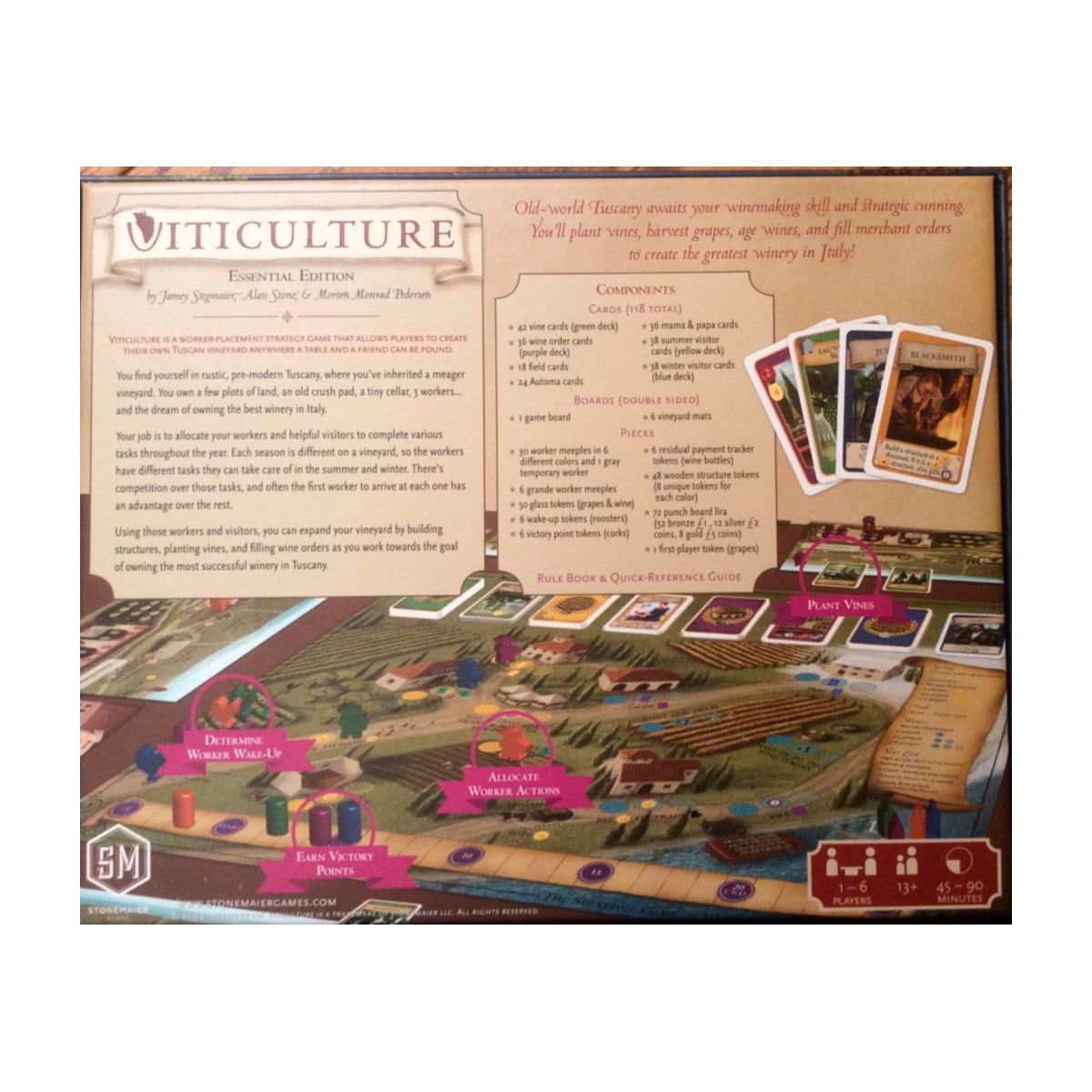 Viticulture Essential Edition incluye el juego básico de Viticulture y algunos de los módulos más populares de la expansión original de Tuscany, incluidos Mamas & Papas, Fields (anteriormente conocidos como Propiedades), Visitantes ampliados y revisados y tarjetas Automa para una variante individual, junto con con algunos cambios menores en las reglas.