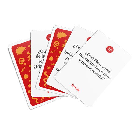 Eso mismo que ellos experimentan ahí, trae Tertulia a tu mesa: un juego que te invita a conectar con otros a través de la lectura, a compartir experiencias, a proponer miradas y, si pinta, a picantearla (hacelo enojar un poco al tío, presentale ideas nuevas, intransigentes... a ver qué pasa). Porque no hay nada más lindo que hablar de lo que leemos (y discutirlo un poquito 😏).